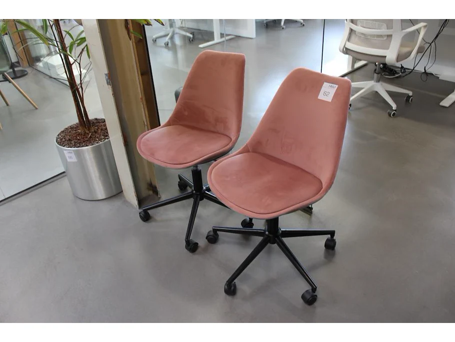 Twee verrijdbare kuipstoelen roze gestoffeerd.
