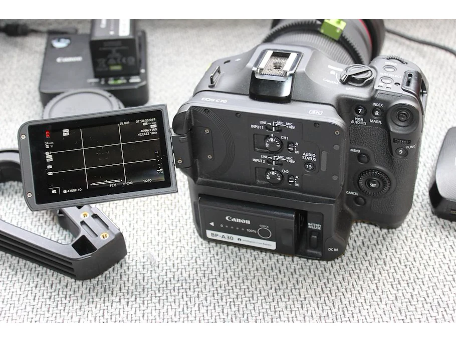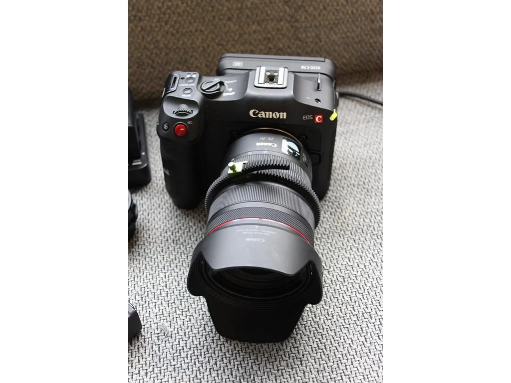 Cinema camera CANON EOS C70 met lens CANON RF 24-70mm F/2,8L IS USM. Uitgerust met een 35mm DGO-sensor voor filmen in 4K tot 120 beelden per seconde. Inclusief 2 accu's, lader, Mount adapter, LEXAR card reader en diverse accessoires in rugtas.