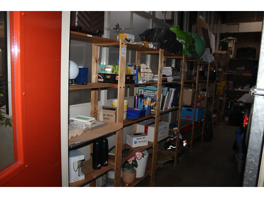 Houten stelling met. Afmeting Ca. 650 x 34 x 170 cm. Ophalen na 13:00.