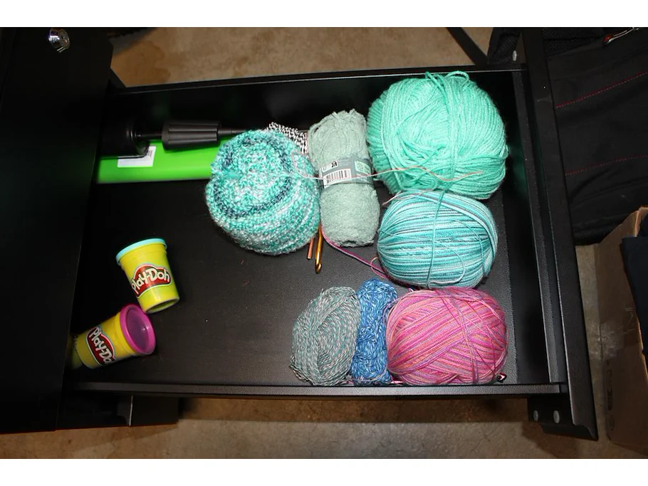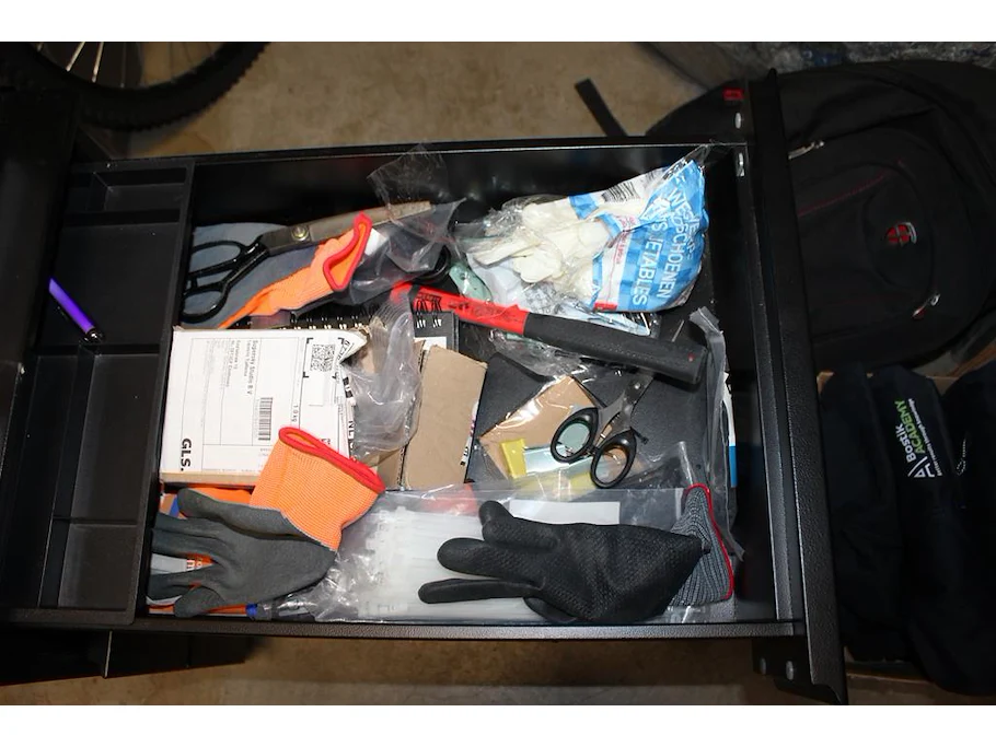 Diverse gereedschappen en klusproducten in en op ladekast.