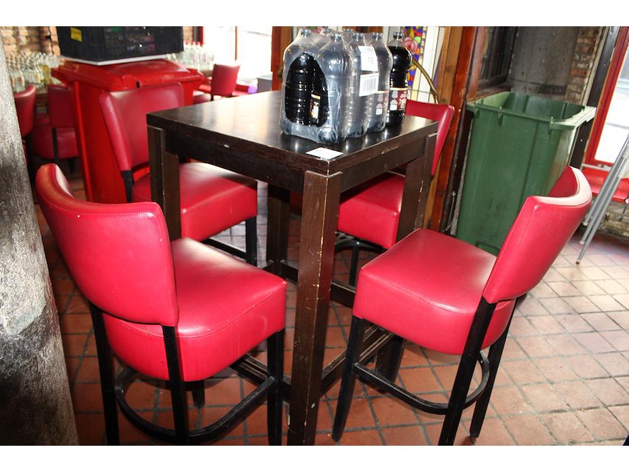 Houten statafel met 4 barkrukken met kunstlederen bekleding. Afmeting tafel 70 x 70 x 110 cm.
