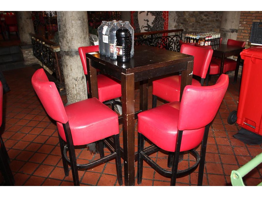 Houten statafel met 4 barkrukken met kunstlederen bekleding. afmeting tafel 70 x 70 x 110 cm.