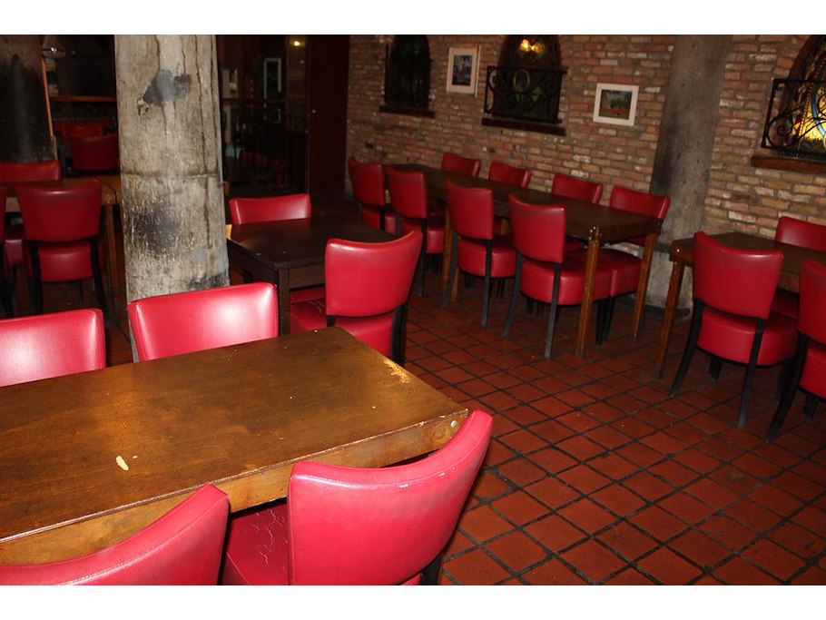 Horecameubilair bestaande uit 30 houten stoelen met kunstlederen bekleding, 9 houten tafels met afmeting 70 x 60 x 75 cm en 3 houten tafels met afmeting 70 x 110 x 75 cm. Let op: onderdeel van combinatiekavel C013. Bekleding van stoelen is in matige tot slechte staat. Stoelen en tafels worden voor de hand uitgegeven.