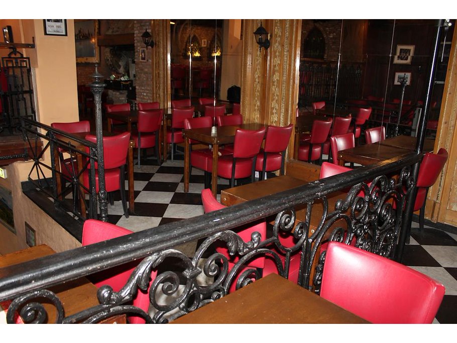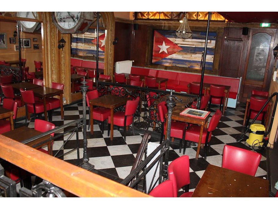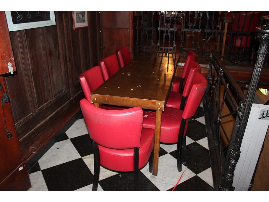 Horecameubilair bestaande uit 30 houten stoelen met kunstlederen bekleding, 9 houten tafels met afmeting 70 x 60 x 75 cm en 3 houten tafels met afmeting 70 x 110 x 75 cm. Let op: onderdeel van combinatiekavel C013. Bekleding van stoelen is in matige tot slechte staat. Stoelen en tafels worden voor de hand uitgegeven.