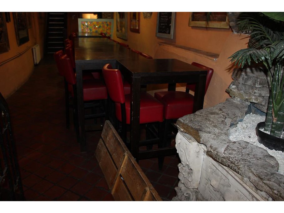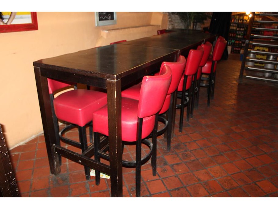 Horecameubilair bestaande uit 3 houten statafels met 6 barkrukken met kunstlederen bekleding. Bekleding is in matige tot slechte staat