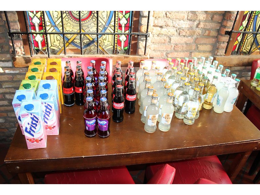 Frisdrank op drie tafels waaronder water, Coca Cola, Fanta etc. Ruim 150 flesjes.