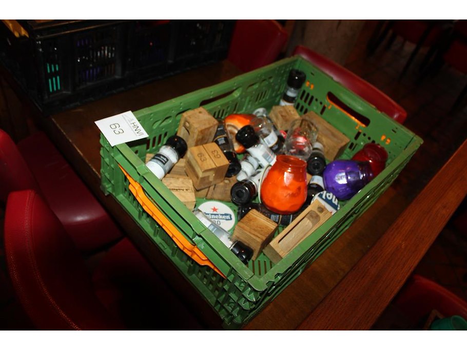 Tafeldecoratie in kunststoffen krat waaronder peper/zout stellen en menuhouders.