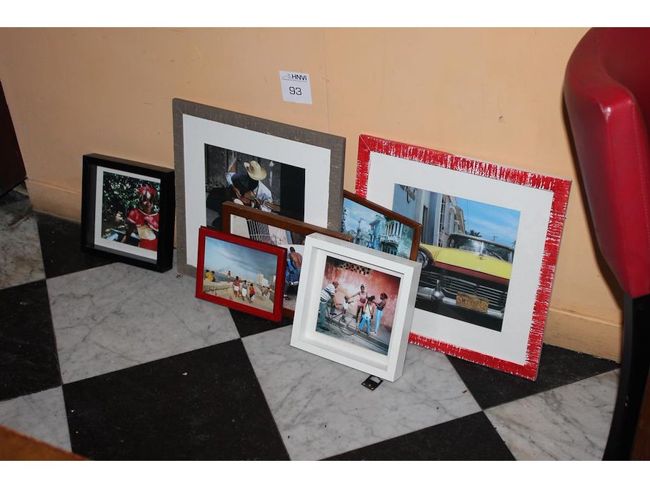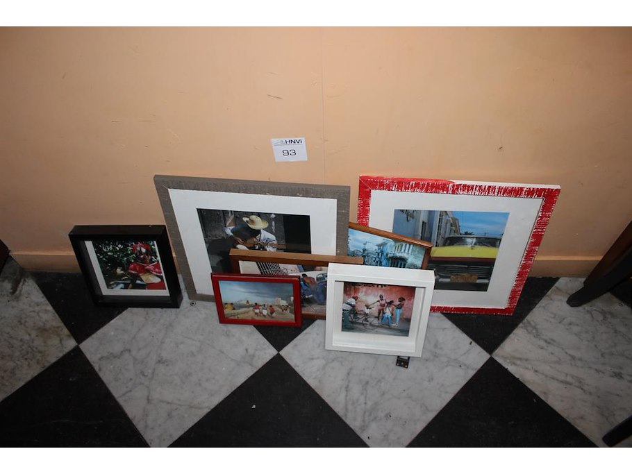 Zeven diverse prenten in lijst.