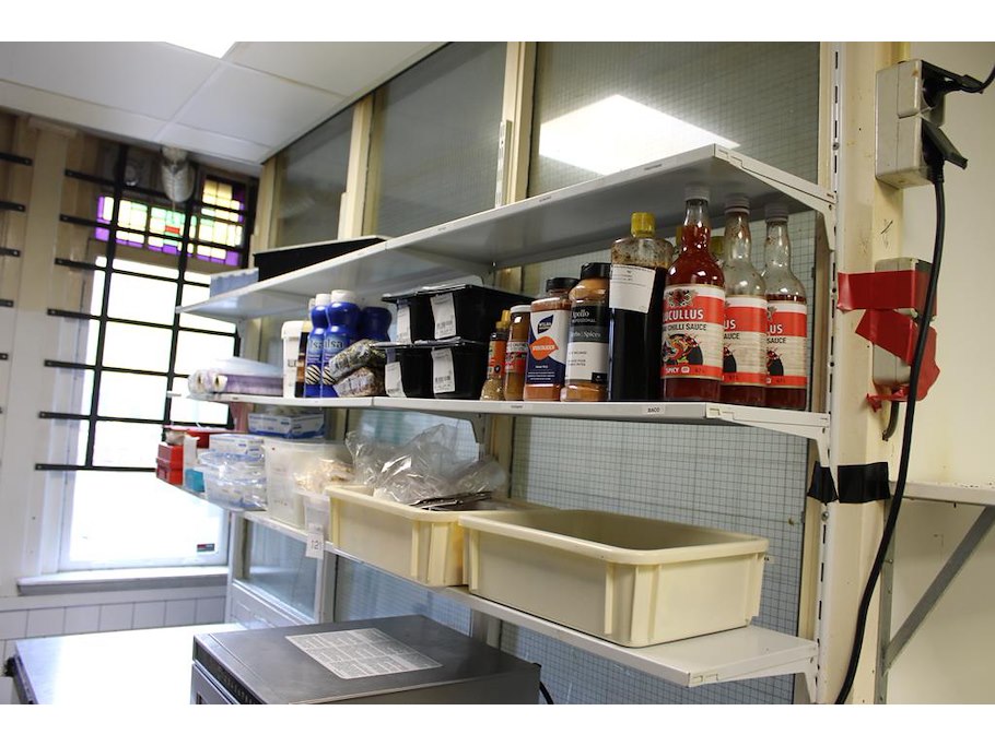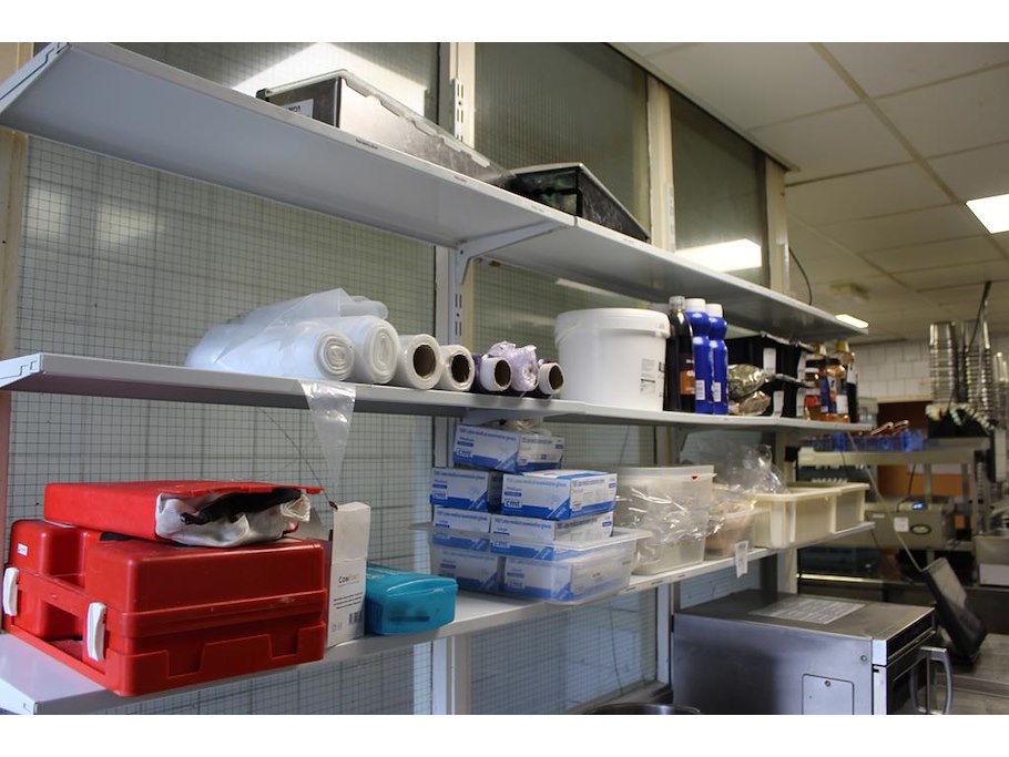 Diverse drooggoed verbandmaterialen en disposables op twee schappen.