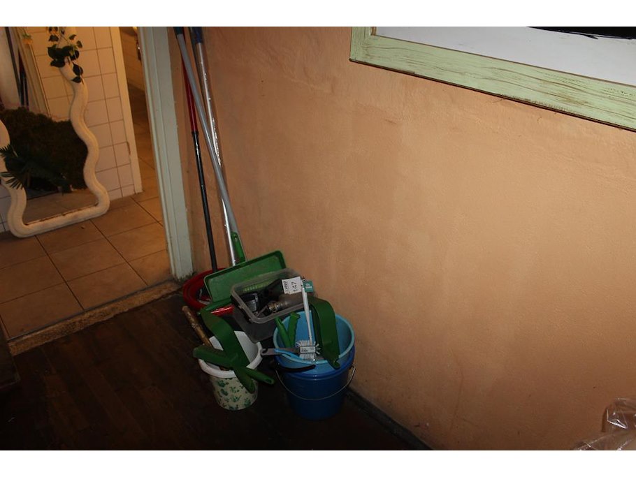 Poetsgereedschap waaronder emmers stoffer en blik en afwasborstels.