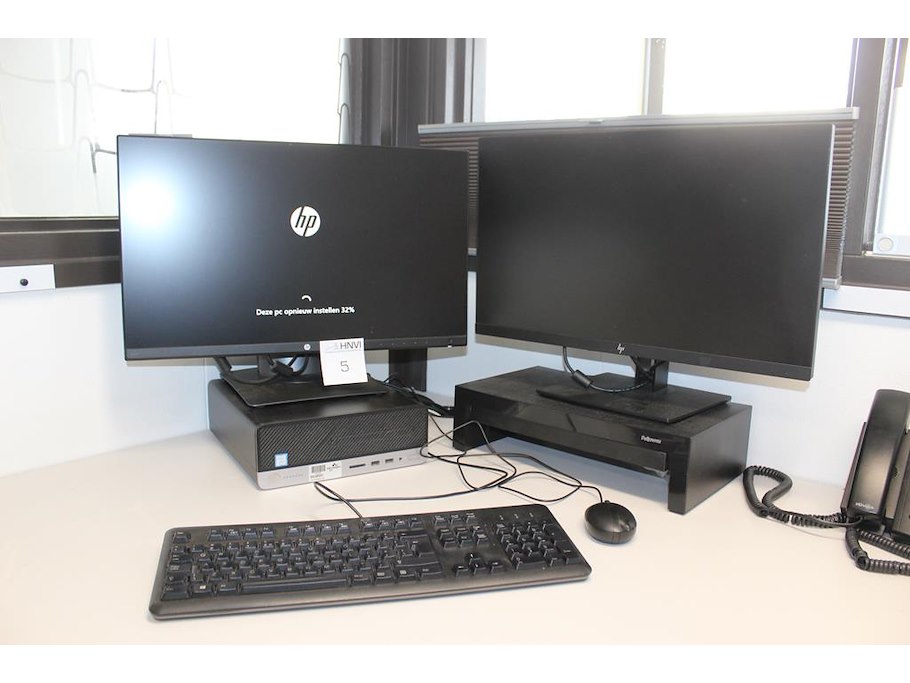 PC opstelling HP ProDesk 8GB RAM, 256GB opslag, 128MB grafische kaart, Intel i5-8500 CPU 3GHz, incl. HP 24 inch monitoren met toetsenbord en muis.