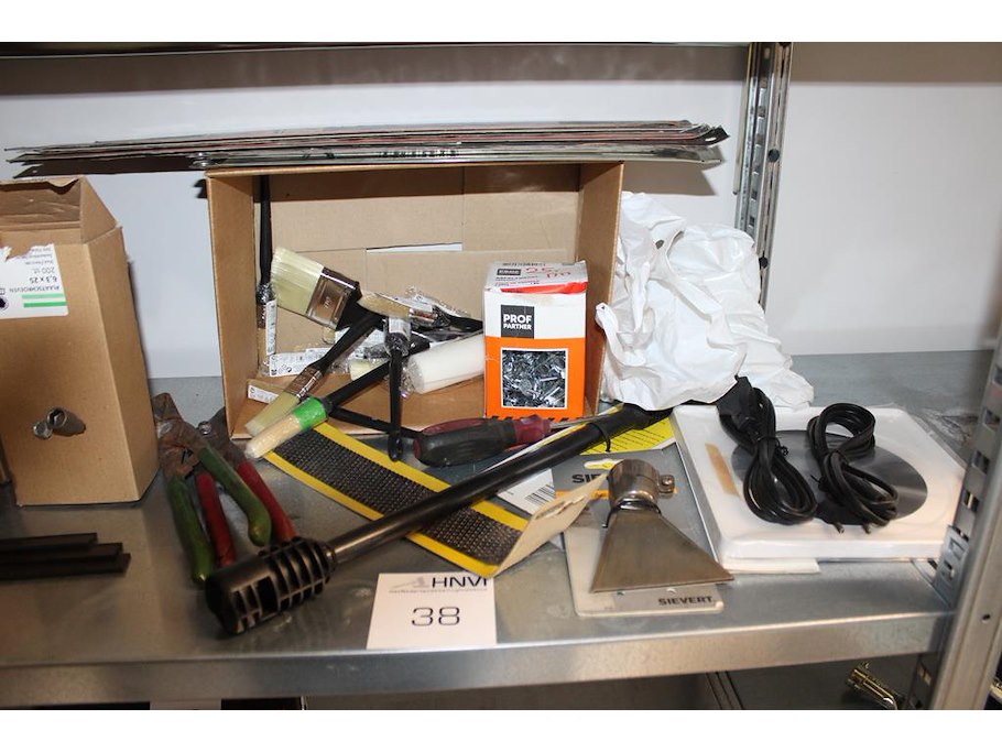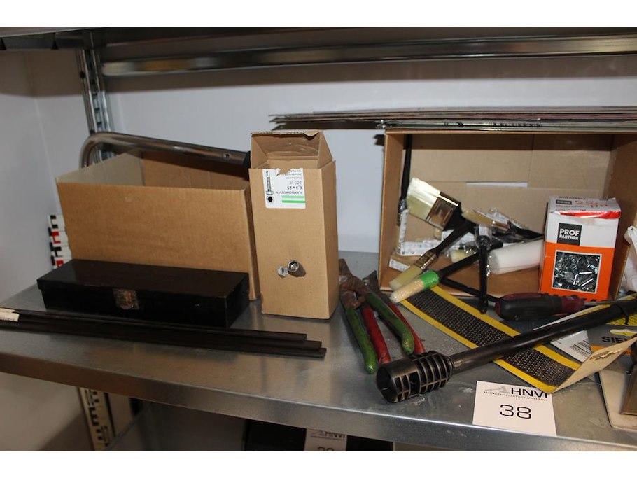 Handgereedschappen en accessoires w.o. tangen, kwasten, zaagbladen enz. op schap.