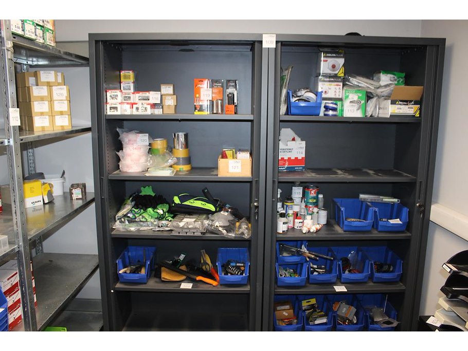 Twee magazijnkasten met twee roldeuren. Afmeting 100 x 44 x 189 cm. LET OP: excl. inhoud.