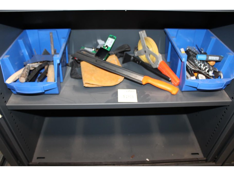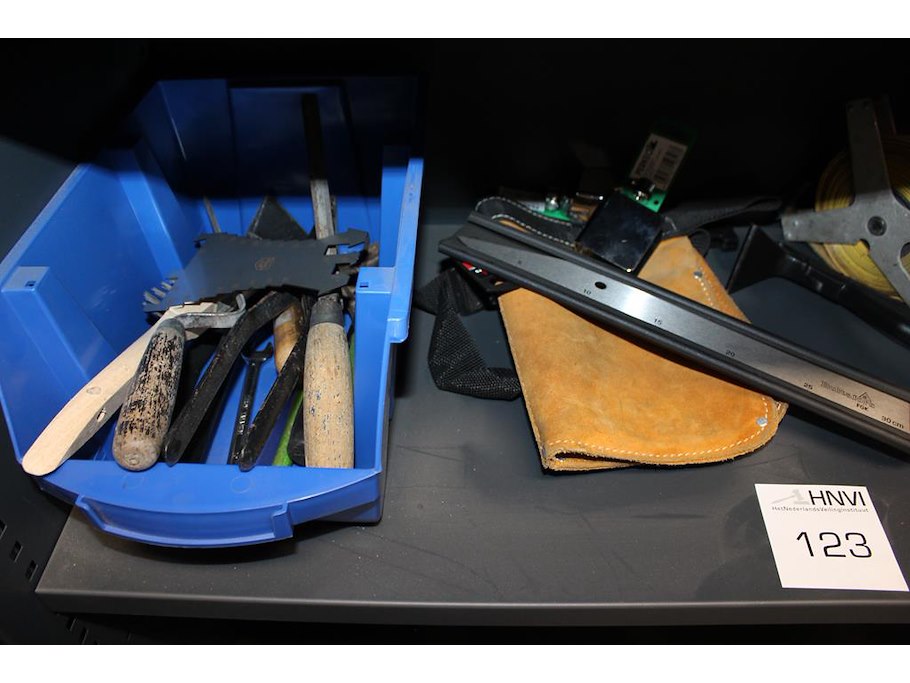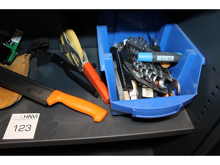 Diverse gereedschappen w.o. buigtangen, steeksleutels en zaag op schap.