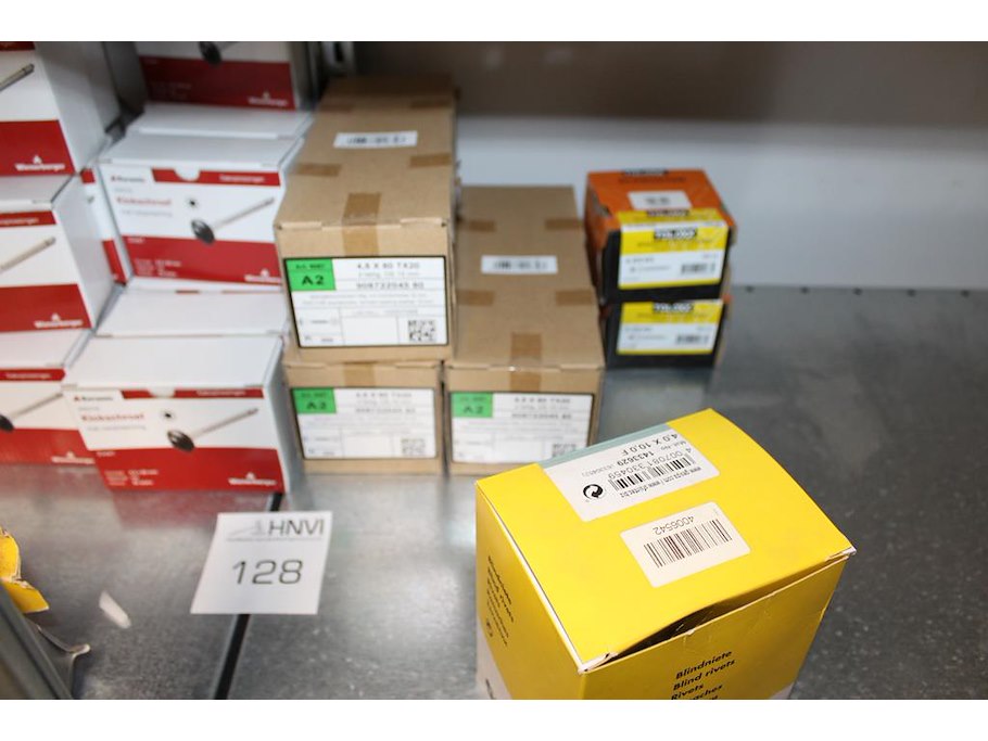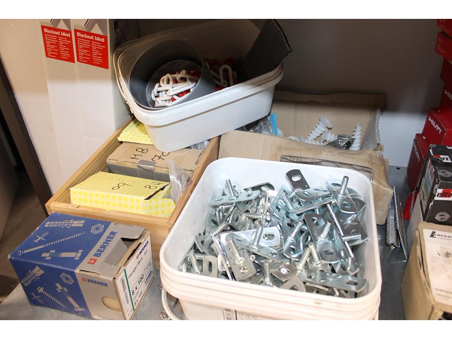 Diverse bevestigingsmaterialen op schap w.o. schroeven, ankers, rivetten enz.