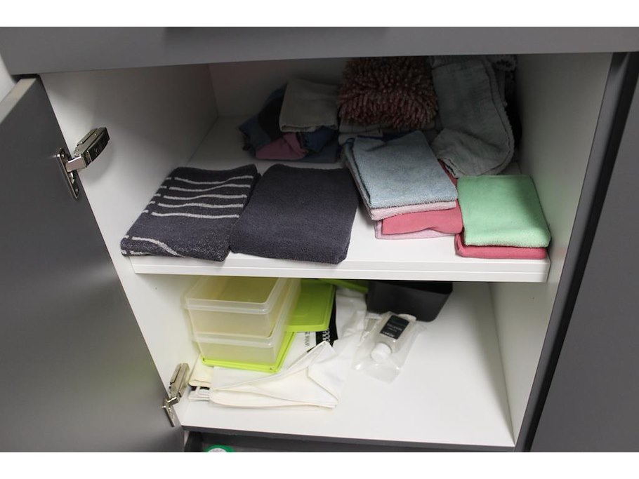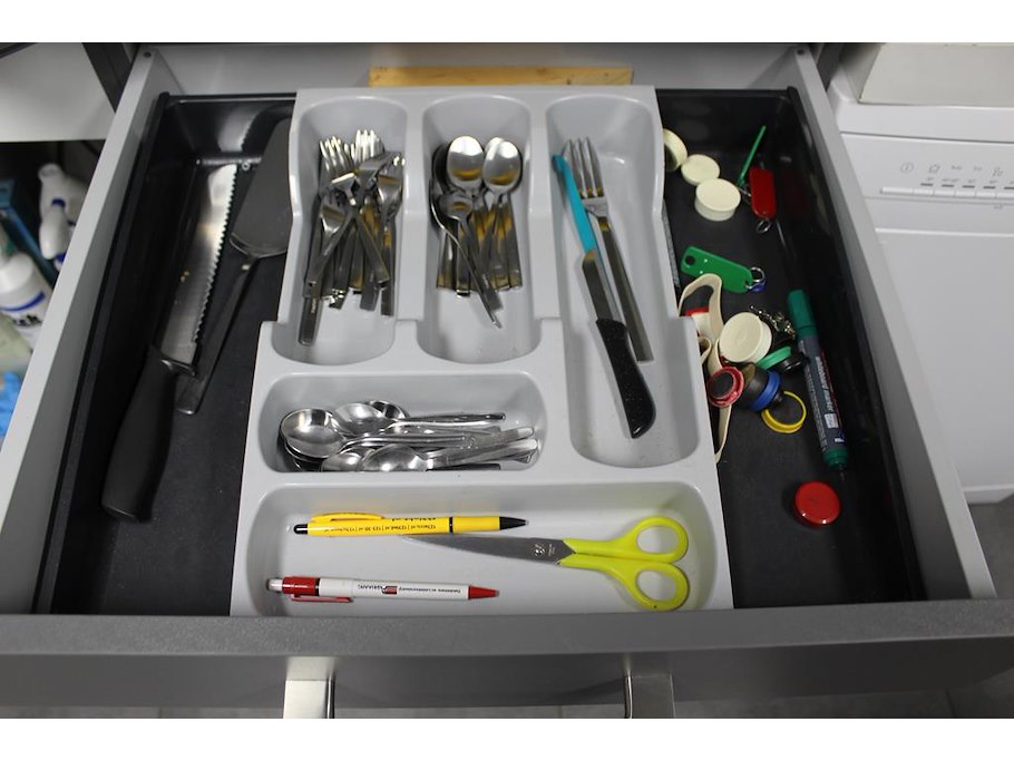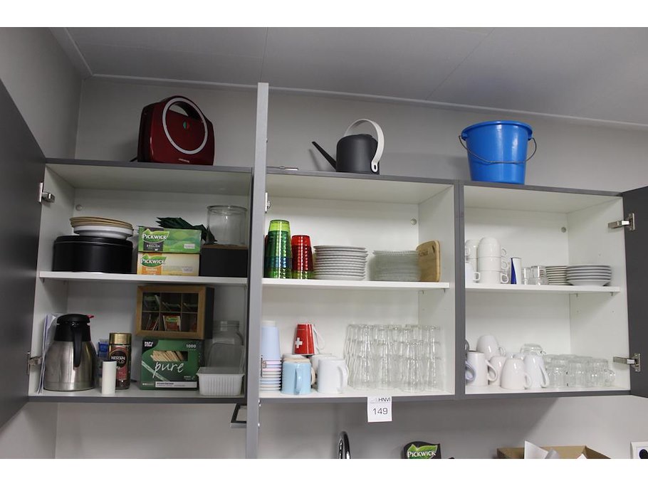 Inhoud keukenblok w.o. glaswerk, servies, bestek, reinigingsdoeken- en middelen.