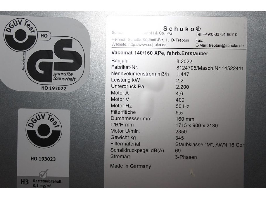 Afzuiginstallatie schuko vacomat 140/160 xpe. bouwjaar 2022. afmeting 1715 x 900 x 2130 mm. max 1447 kuub p...