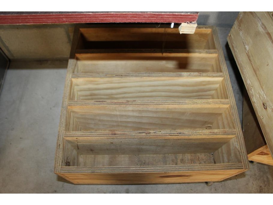 Zes verrijdbare houten kratten. Afmeting 50 x 50 x 29 cm.