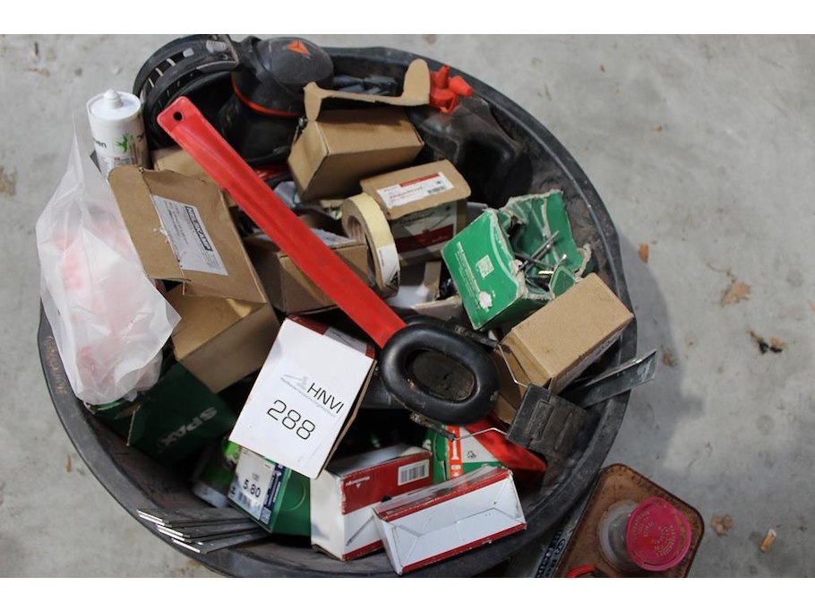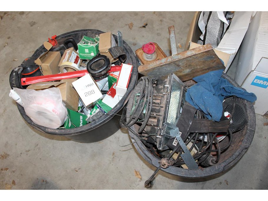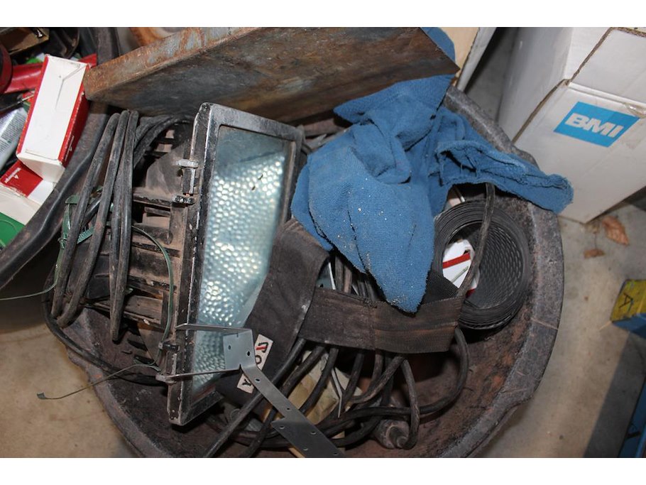Bouwgerelateerde producten in twee cementkuipen w.o. bouwlamp, gehoorbescherming enz.