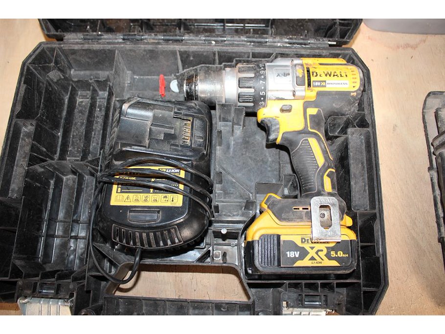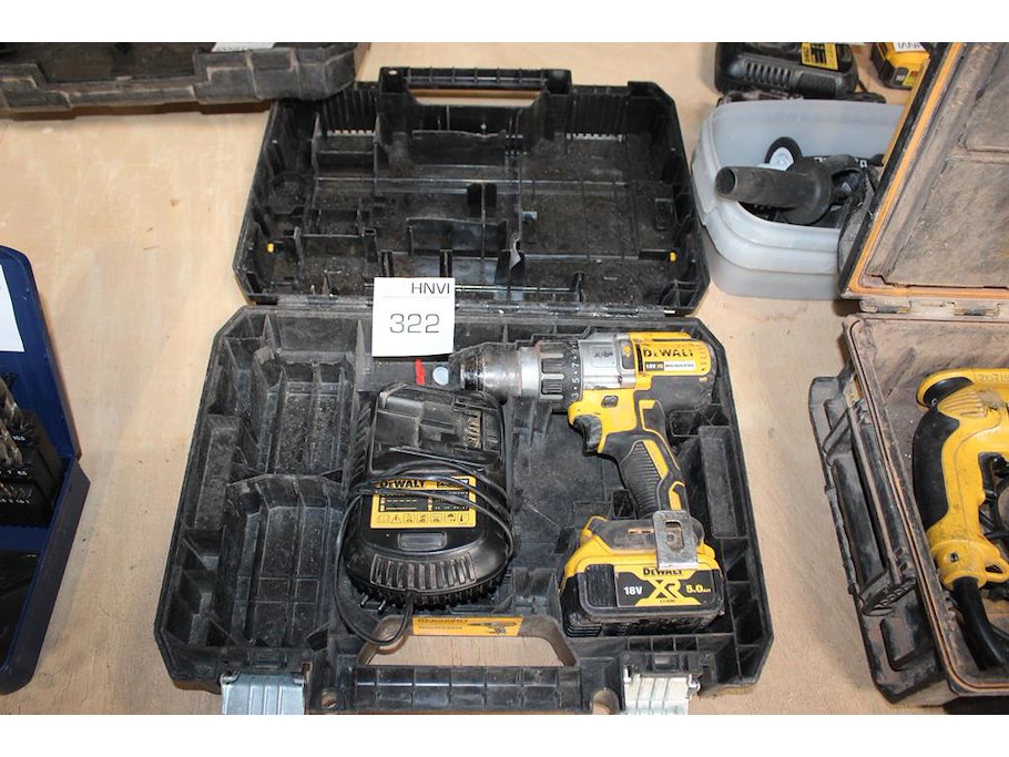 Accu schroefboormachine dewalt met accu en lader in kunststof koffer.