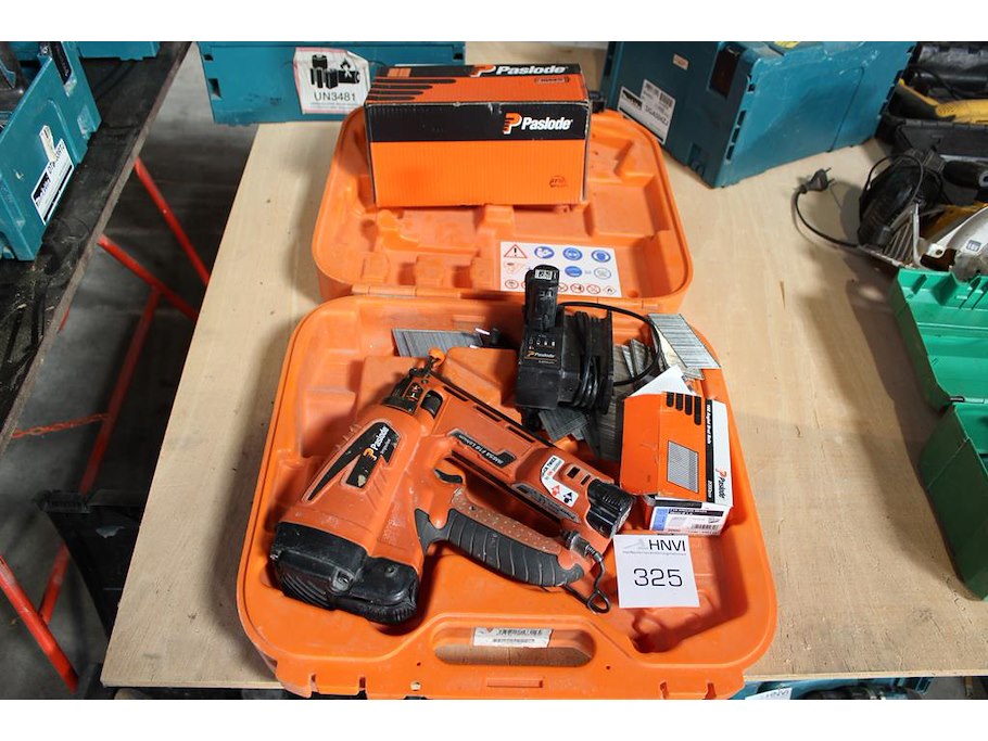 Accu tacker PASLODE met twee accu's en lader in kunststof koffer.