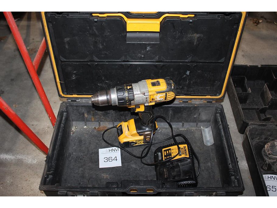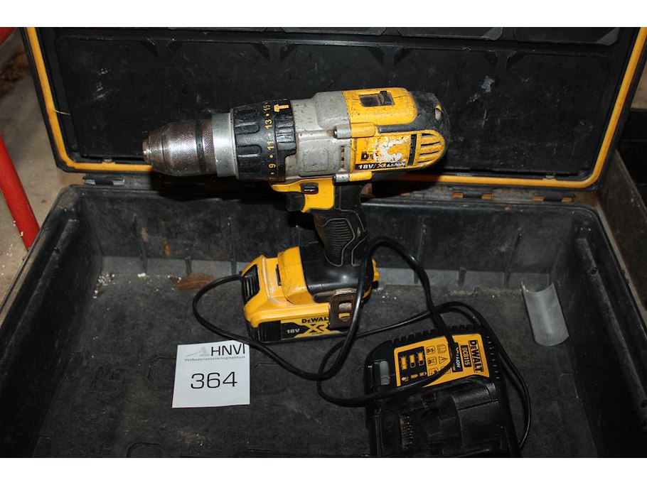 Accu schroefboormachine dewalt met accu en lader in kunststofkoffer.