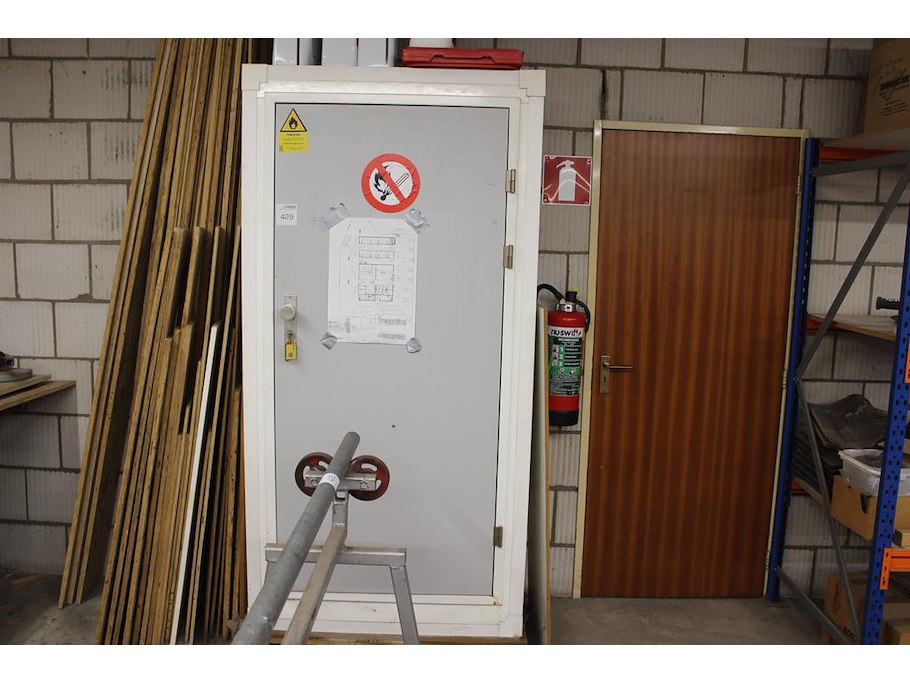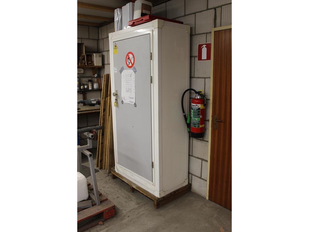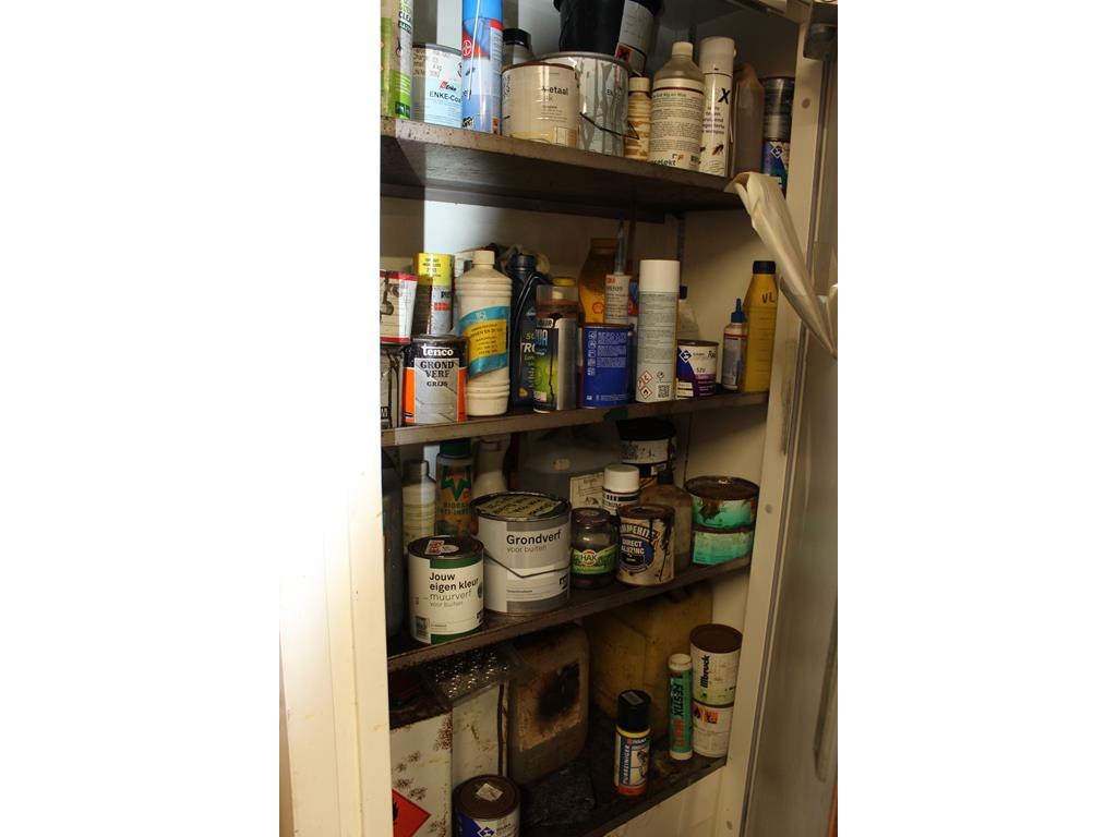Chemiekast met diverse producten w.o. lakken, grondverf, 2-componenten opvuller en regendicht. Afmeting 101 x 53 x 201 cm.