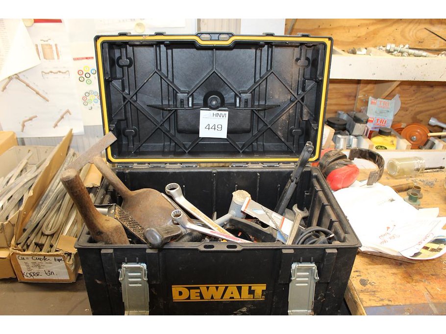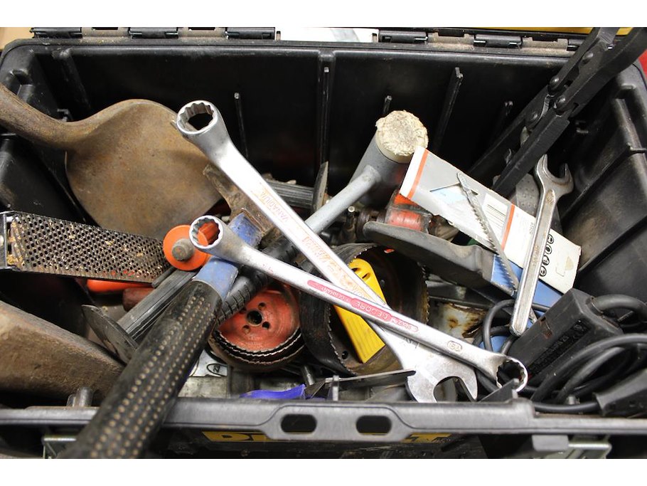 Gereedschapskist met diverse gereedschappen w.o. hamer, tangen en gatenboor.