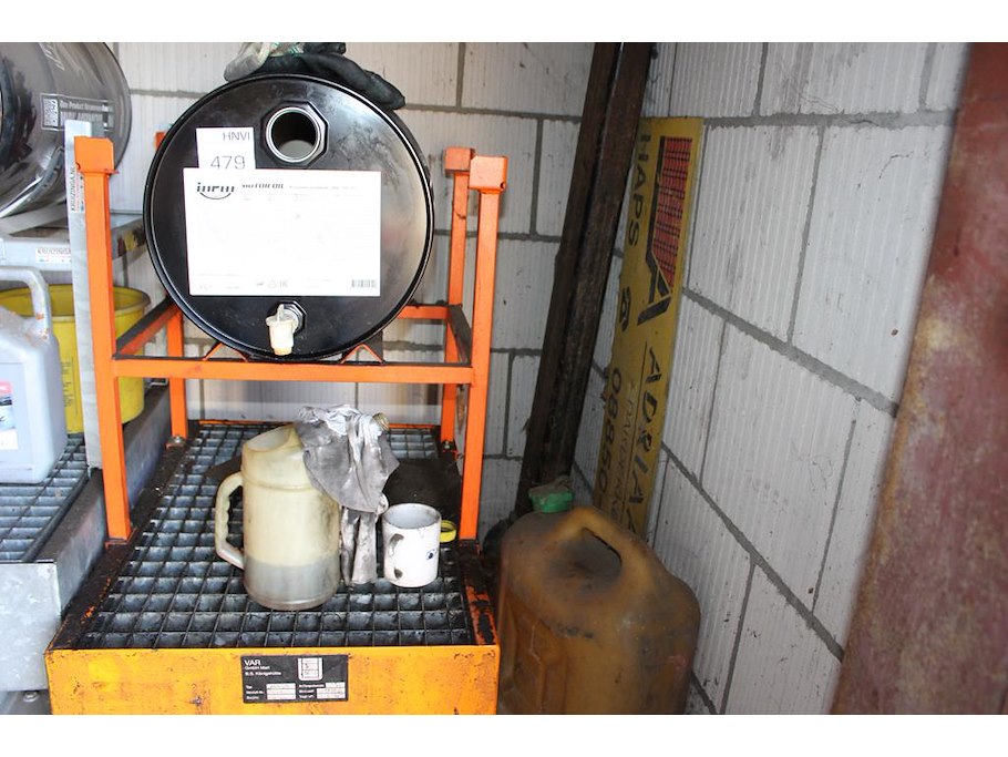 Verrijdbare oliedrum houder met lekbak PAR met diverse cans.