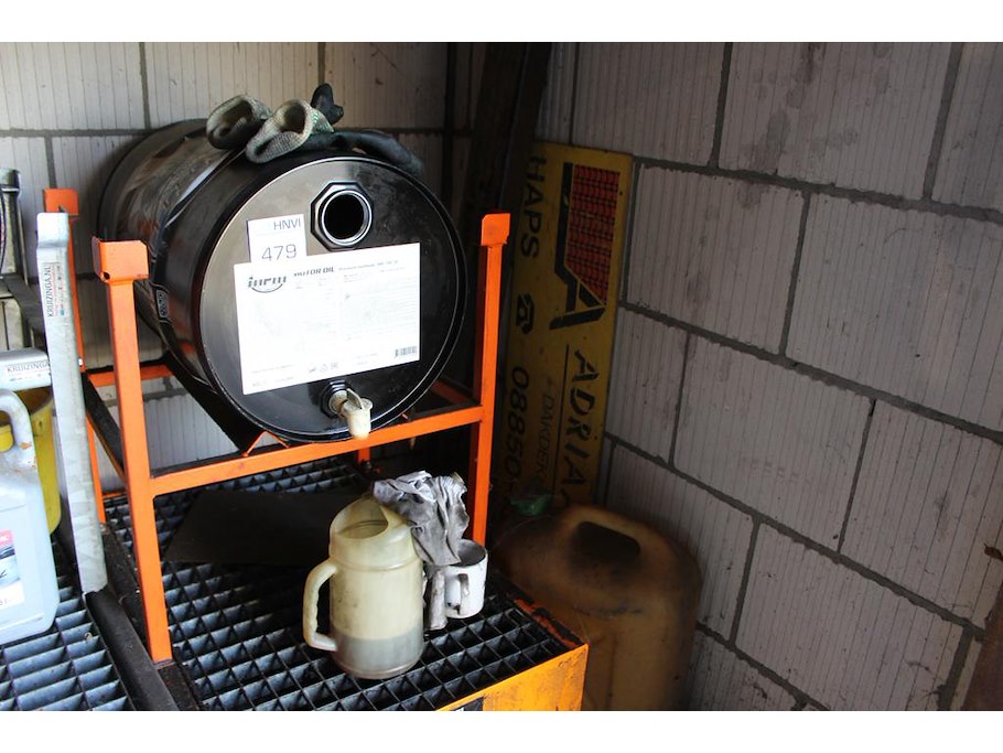 Verrijdbare oliedrum houder met lekbak par met diverse cans.