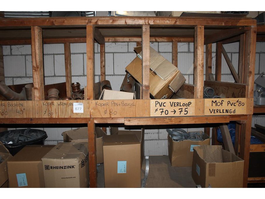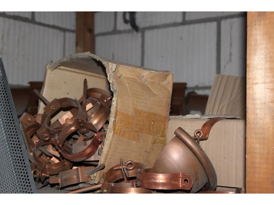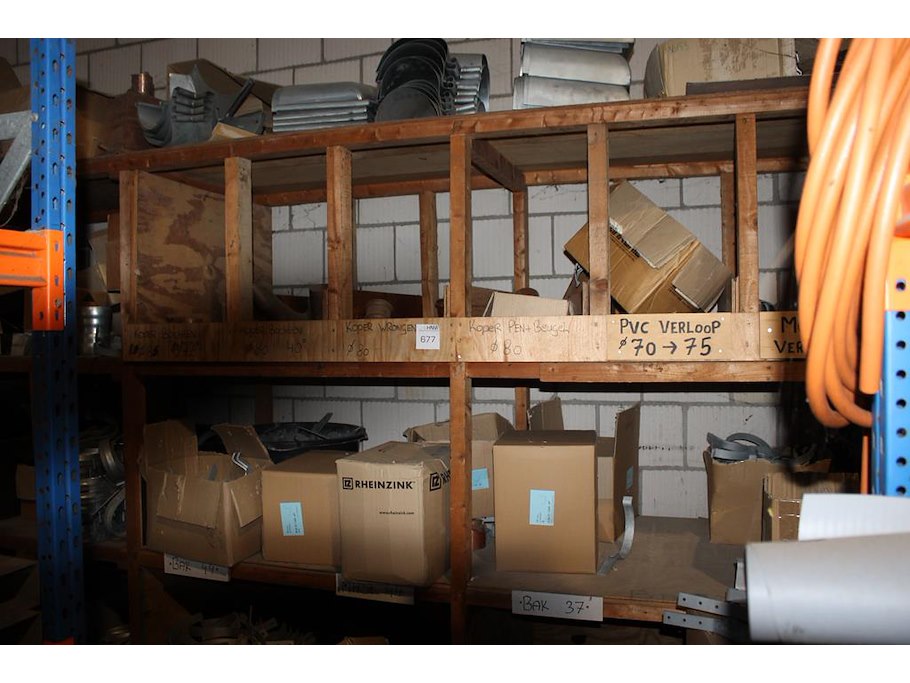 Metalen gootstukken, wrongen, verlopen, goothoeken, gootbeugels, etc. in houten stelling.