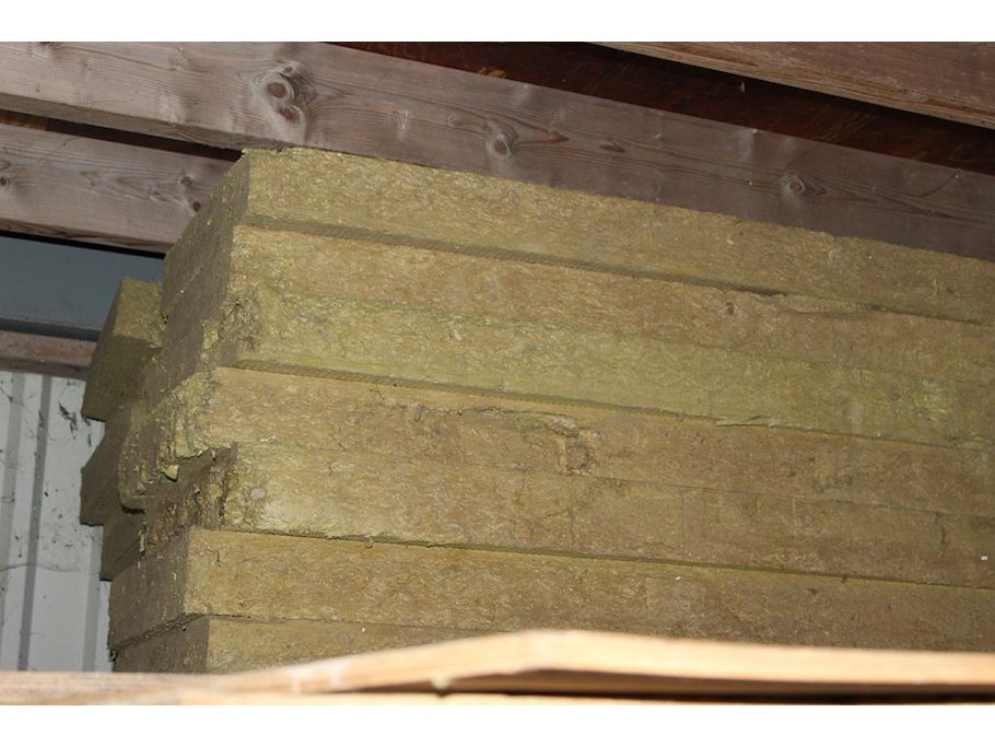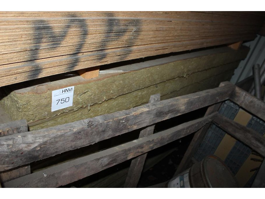 Twee stapels isolatiemateriaal w.o. 90 cm wol met houten afdekking. Totaal ca. 70 stuks 60 x 200 cm.