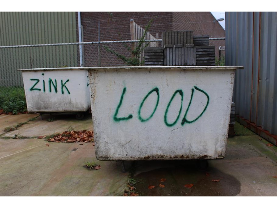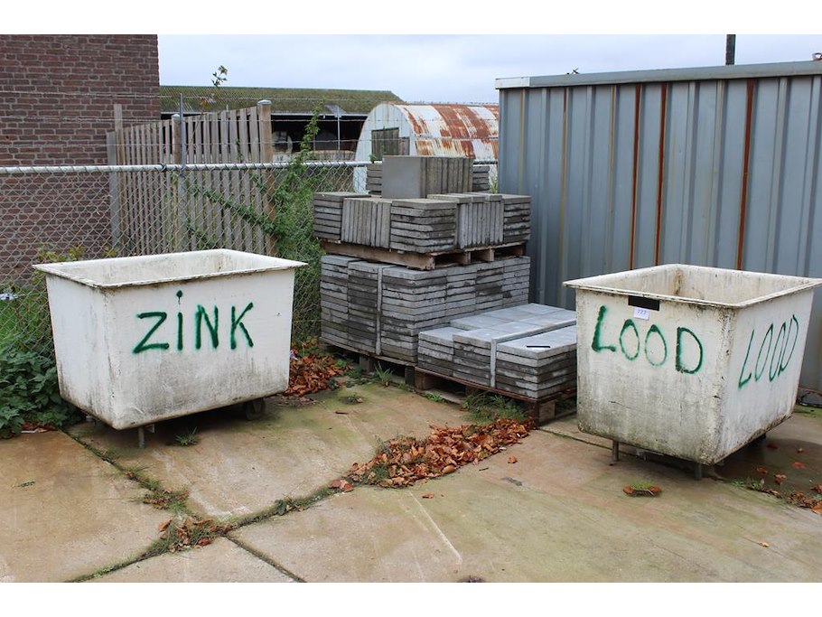 Twee semi-verrijdbare transportbakken. afmeting 122 x 89 x 92 cm.