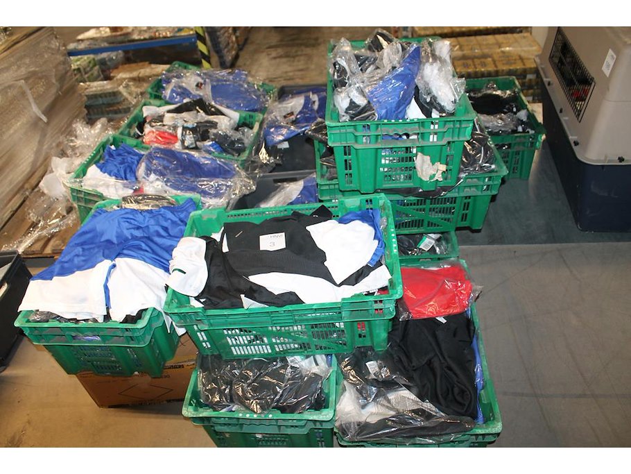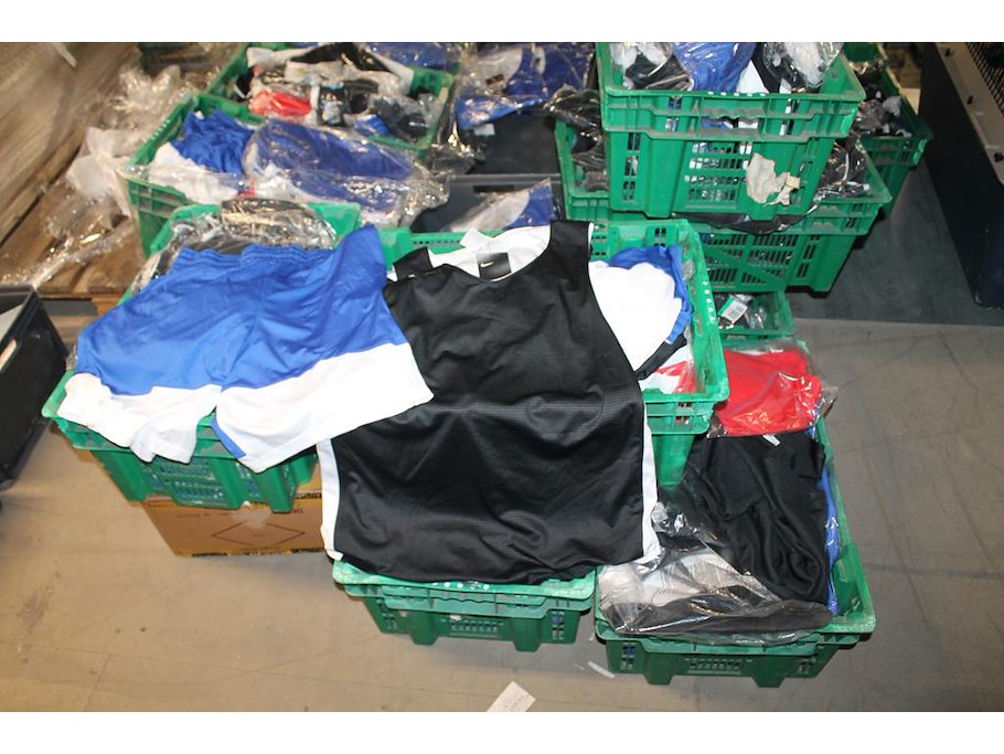 350 stuks basketbal kleding NIKE w.o. shirts en short in diverse kleuren, maten en uitvoeringen in 14 kunststof kratten. Ruim 350 items.
