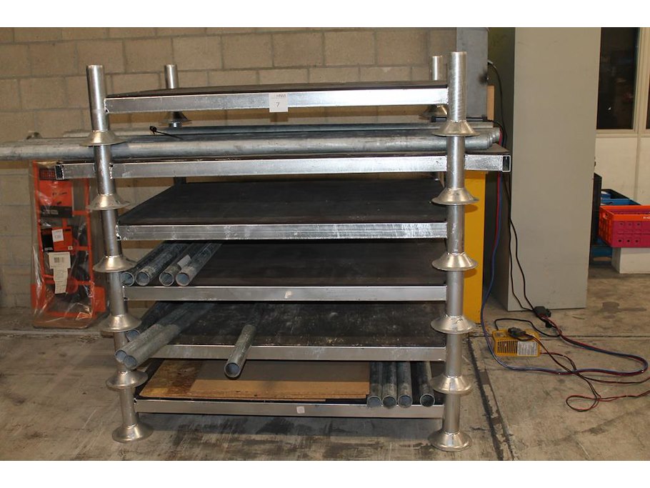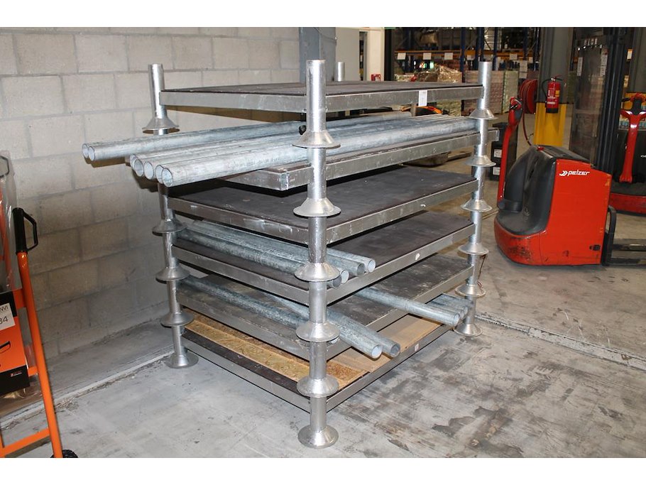 Acht gegalvaniseerde stapelbare bokken met 24 opzetstangen met diverse lengtes. Afmeting 145 x 110 cm.