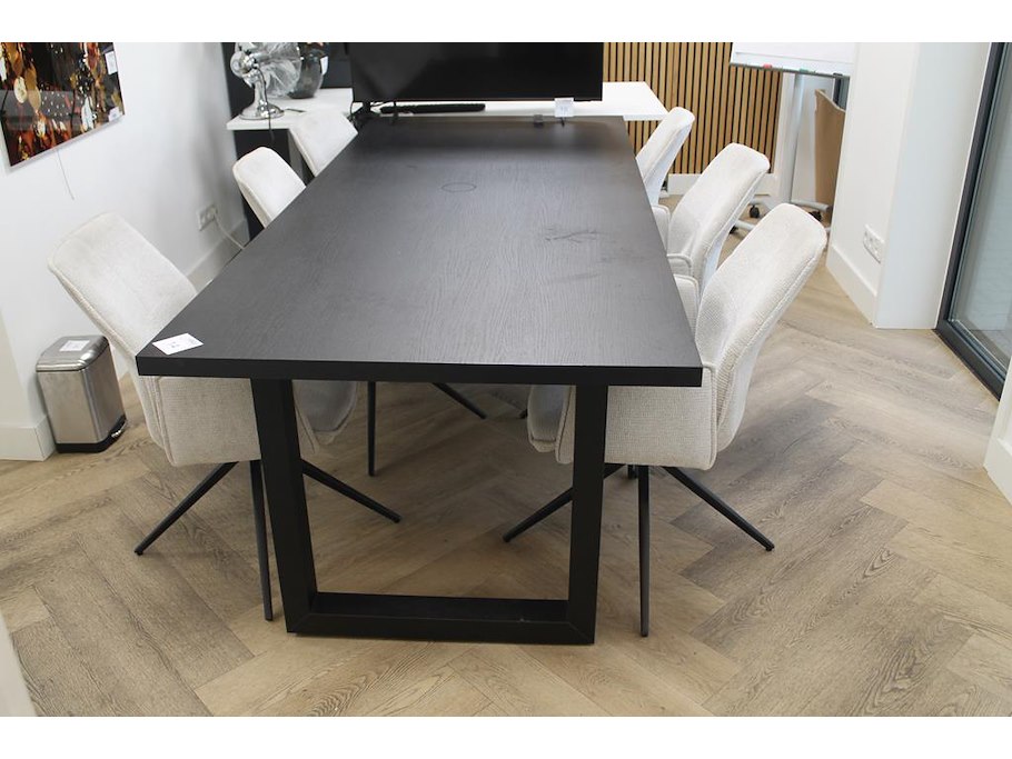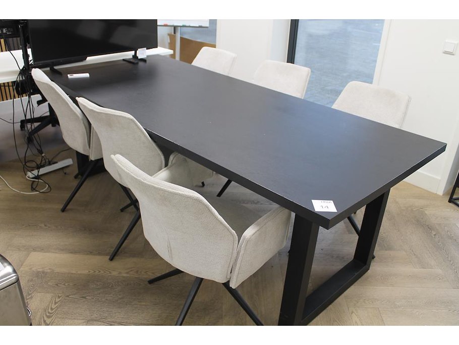 Spreektafel met 6 gestoffeerde draaibare kuipstoelen. tafelafmeting 230 x 100 x 78 cm.