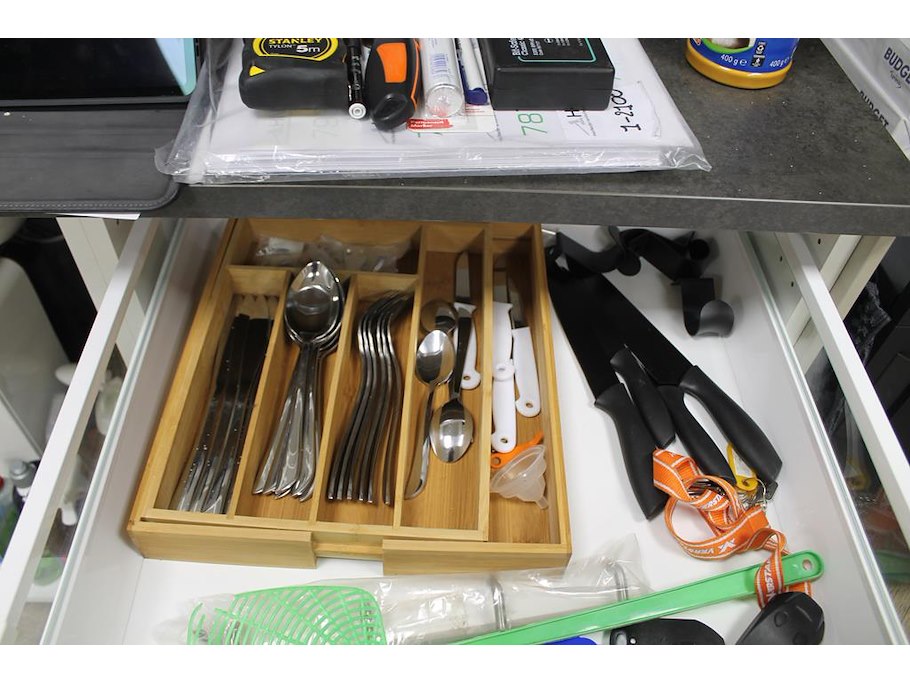 Inhoud keukenkastjes w.o. servies, glaswerk en bestek.