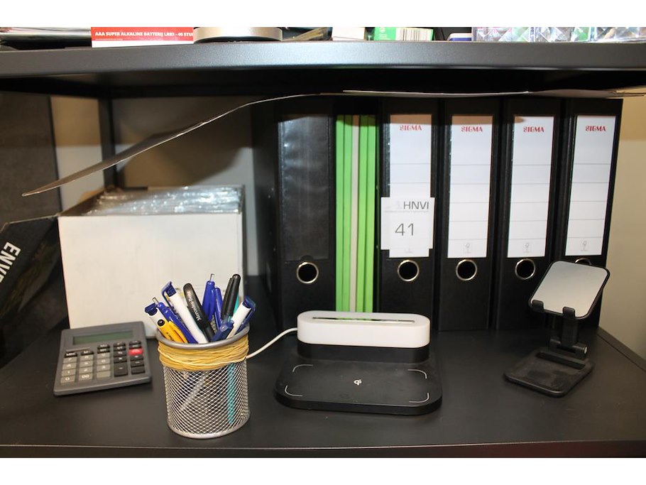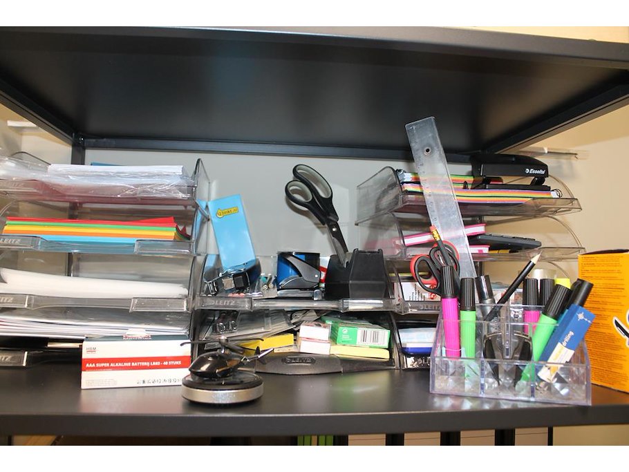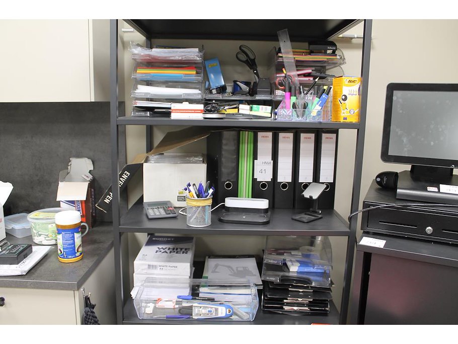 Kantoormaterialen w.o. mappen, schrijfgerei, papier en enveloppen op 3 schappen.