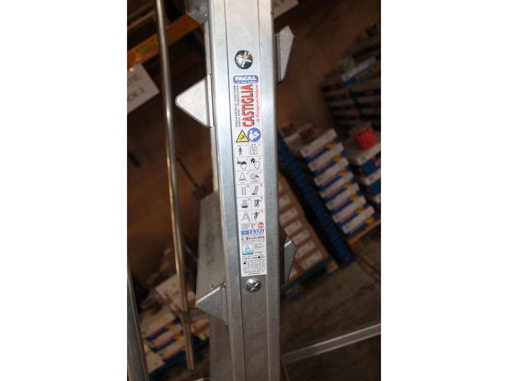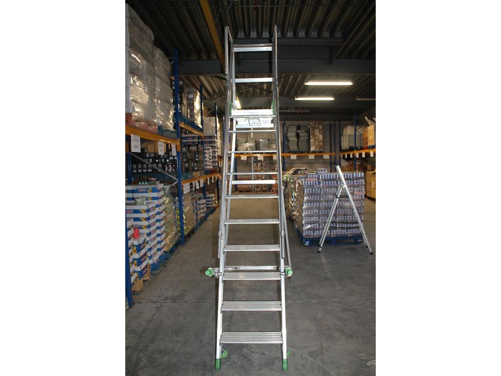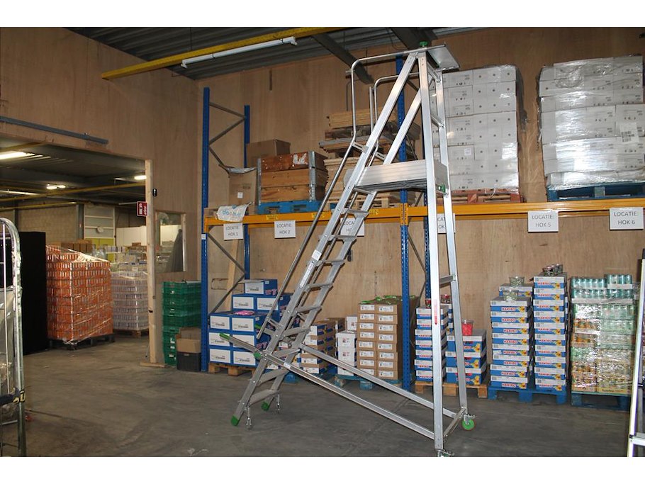 Magazijn- / kasteel-trap castiglia scala a met 9 treden, bordes, leuning en veiligheidsbalkje.