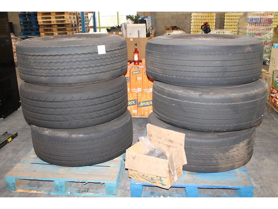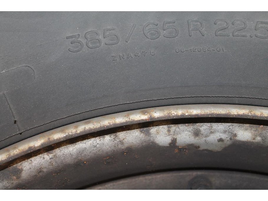 Zes vrachtwagen banden op velg w.o. maatvoering 385/65R22,5.