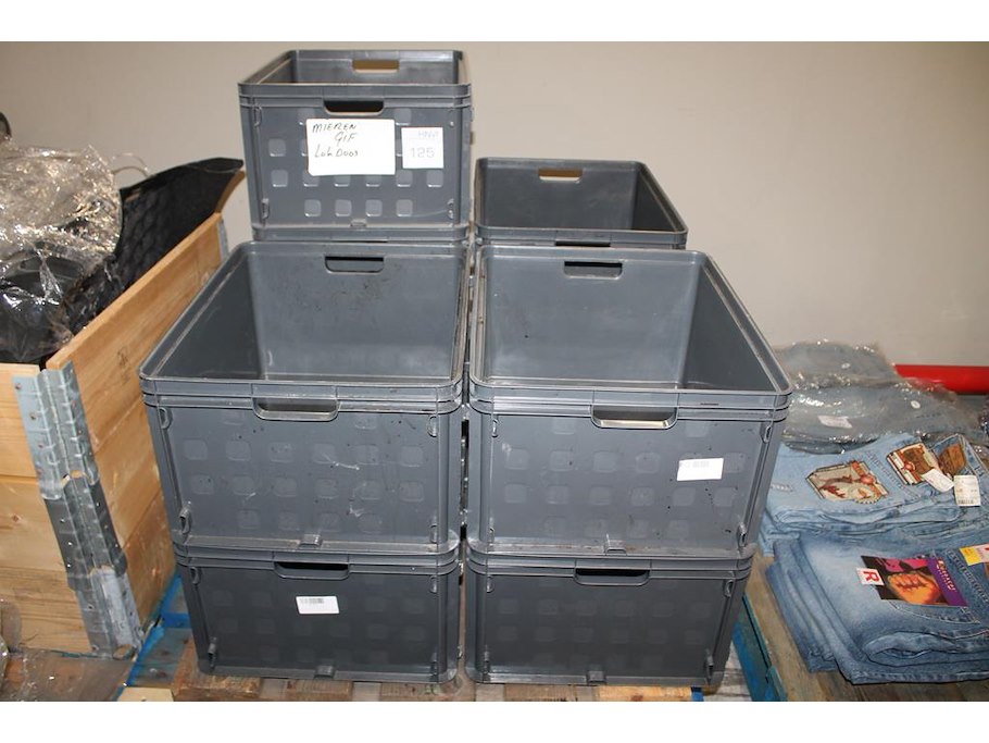 Negen kunststof boxen op pallet. Afmeting 60 x 40 x 27 cm.