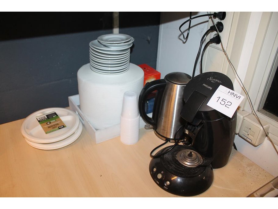 Koffiecorner met SENSEO, waterkoker, bordjes en tissuerol.