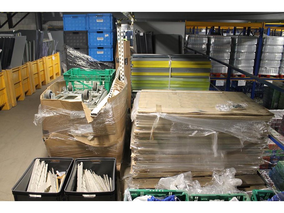 Metalen winkelstelling onderdelen en legborden in en op 17 pallets en 20 kunststof boxen op entresol.