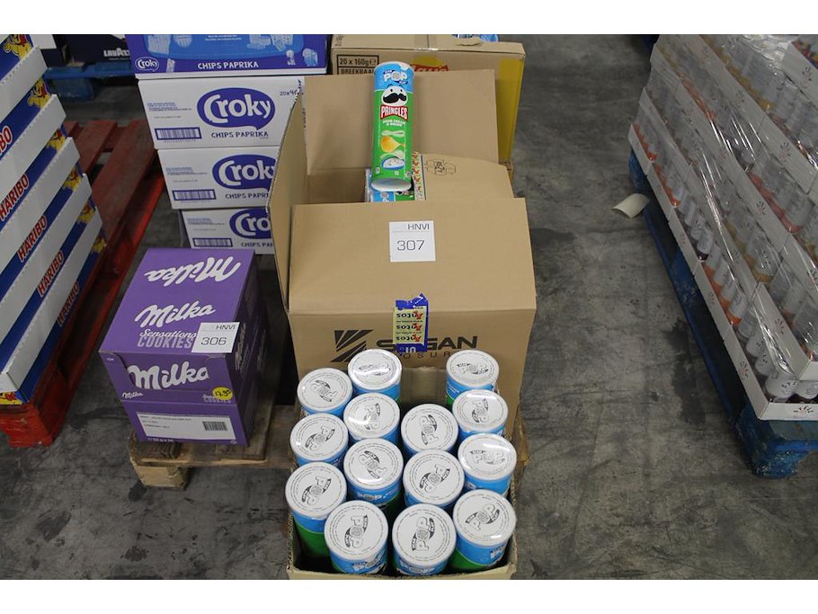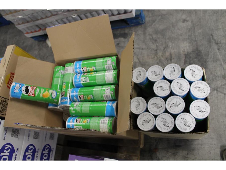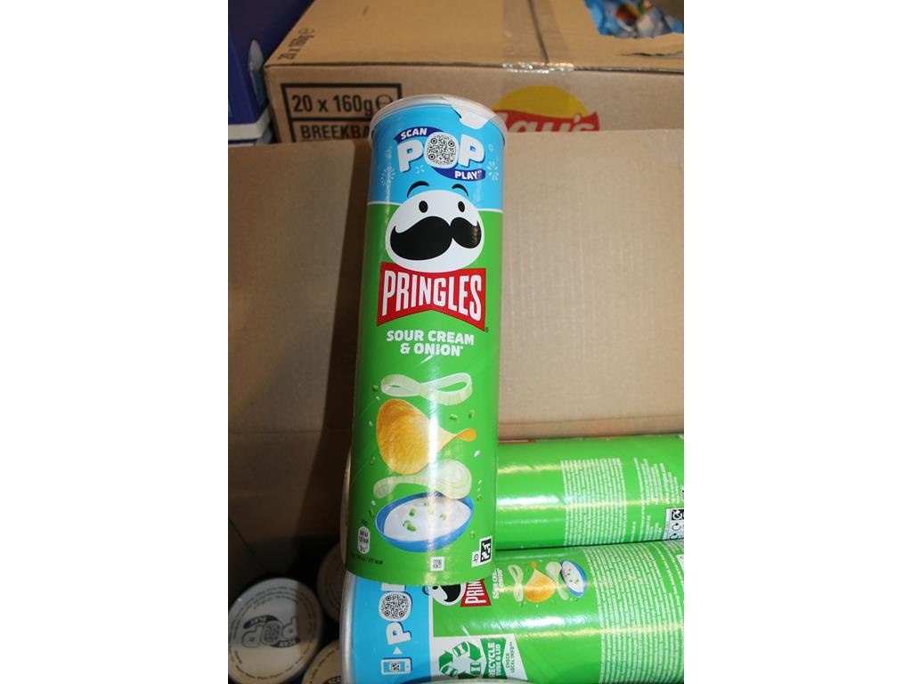 Twee dozen met pringles sour cream & onion. ruim 50 bussen. tht 7-25.