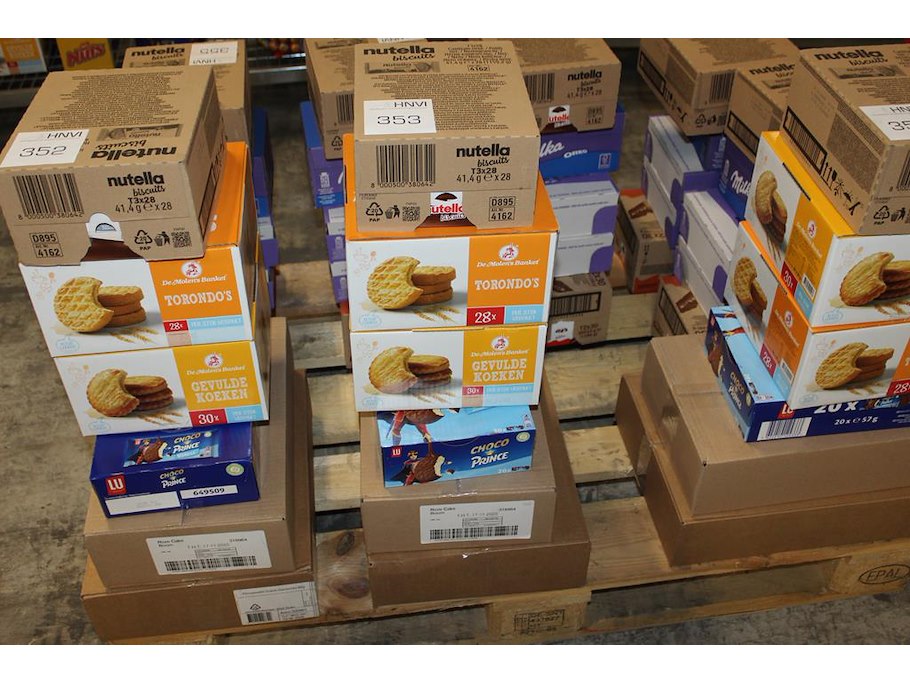 Zes dozen met koeken w.o. stroopwafels, roze cake, chocoprins, gevulde koeken, torondo's en Nutella biscuits. Ca. 200 stuks. THT veelal 11-2025.