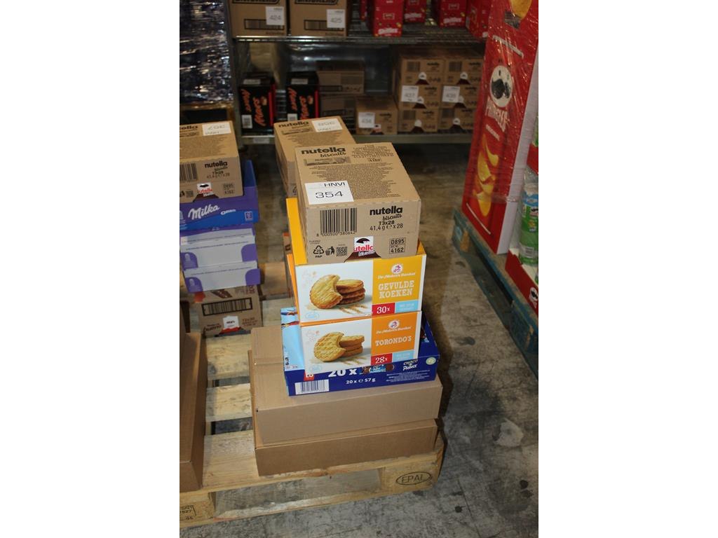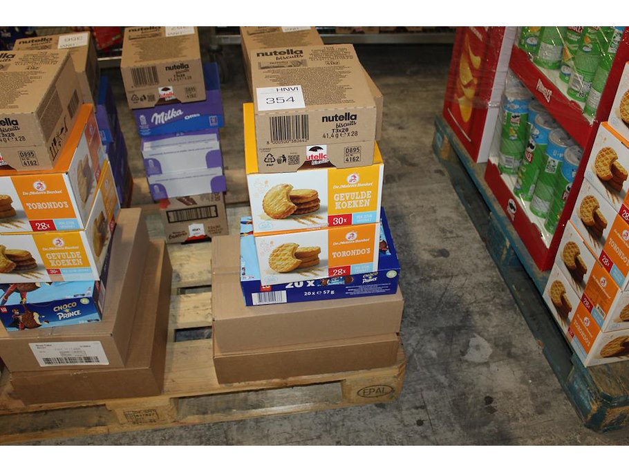 Zes dozen met koeken w.o. stroopwafels, roze cake, chocoprins, gevulde koeken, torondo's en Nutella biscuits. Ca. 200 stuks. THT veelal 11-2025.