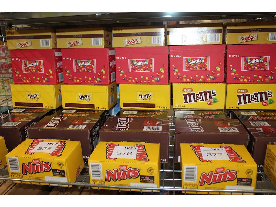 Zeven dozen snoepgoed w.o. NUTS, M&M, MARS, SNICKERS, TWIX en SKITTLES. Totaal 197 stuks.