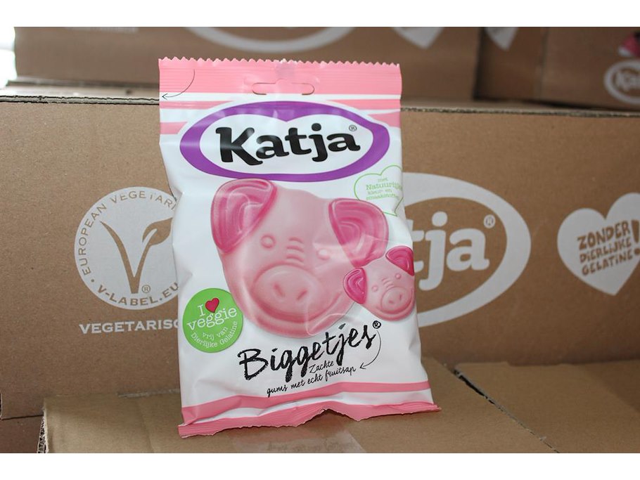KATJA Biggetjes en Yoghurt Gums op pallet. Ca. 140 dozen a 22 zakjes. THT 7/8-25.