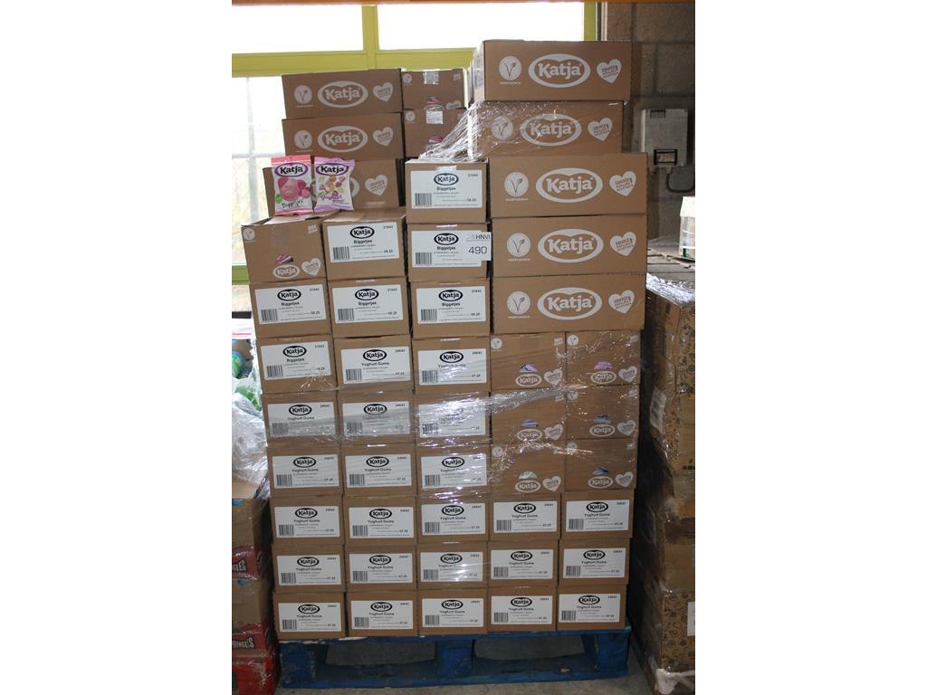Katja biggetjes en yoghurt gums op pallet. ca. 140 dozen a 22 zakjes. tht 7/8-25.
