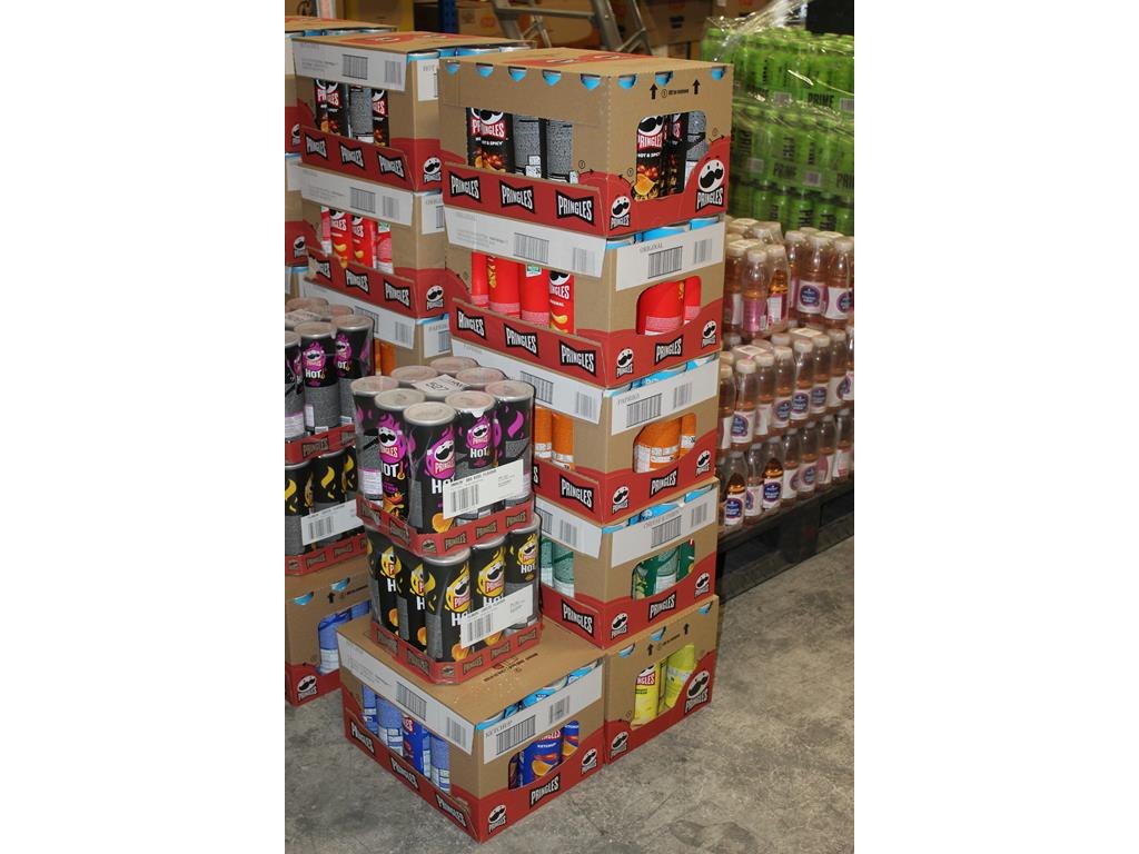 Acht verpakkingen PRINGLES in 8 smaken. Totaal 132 bussen. THT 2026.